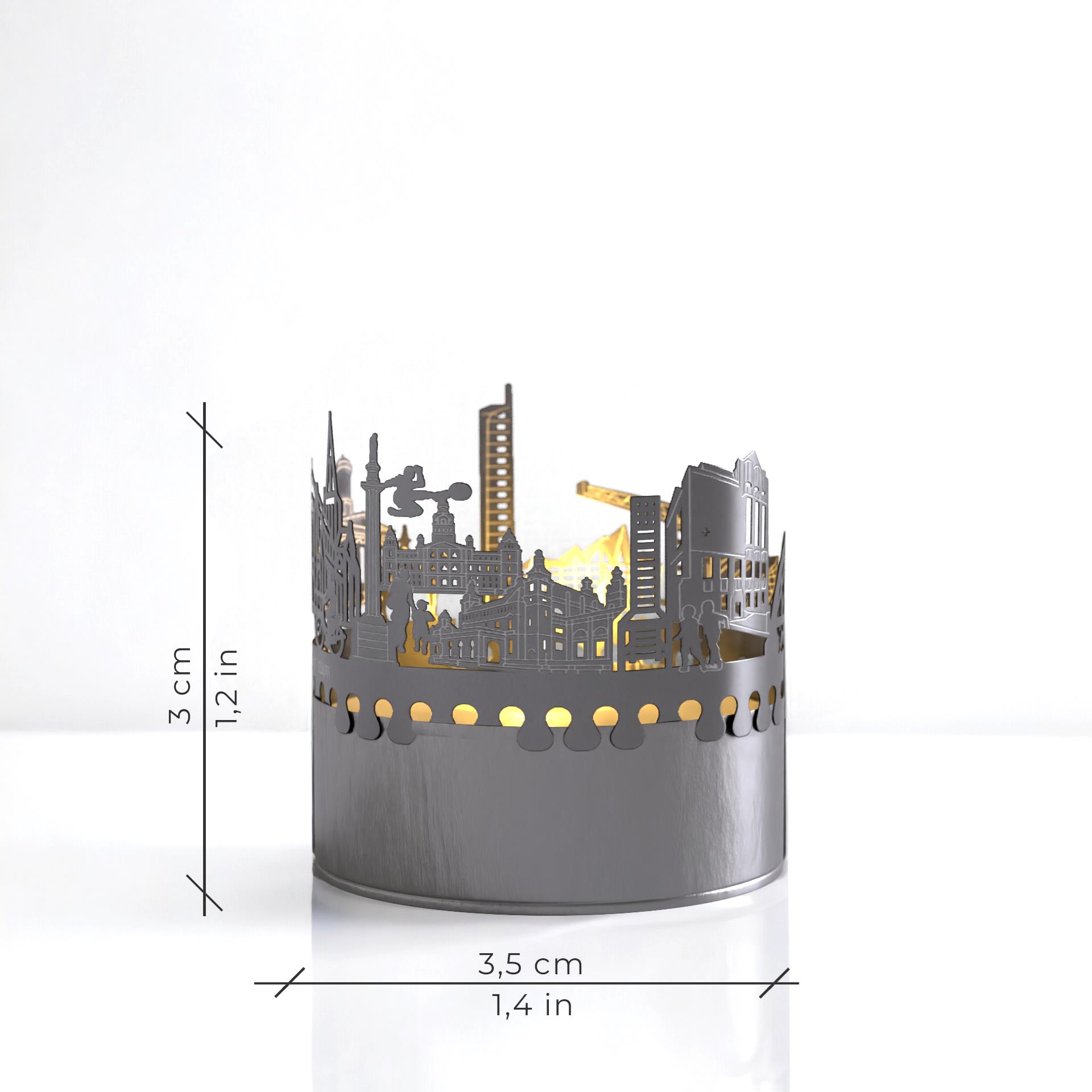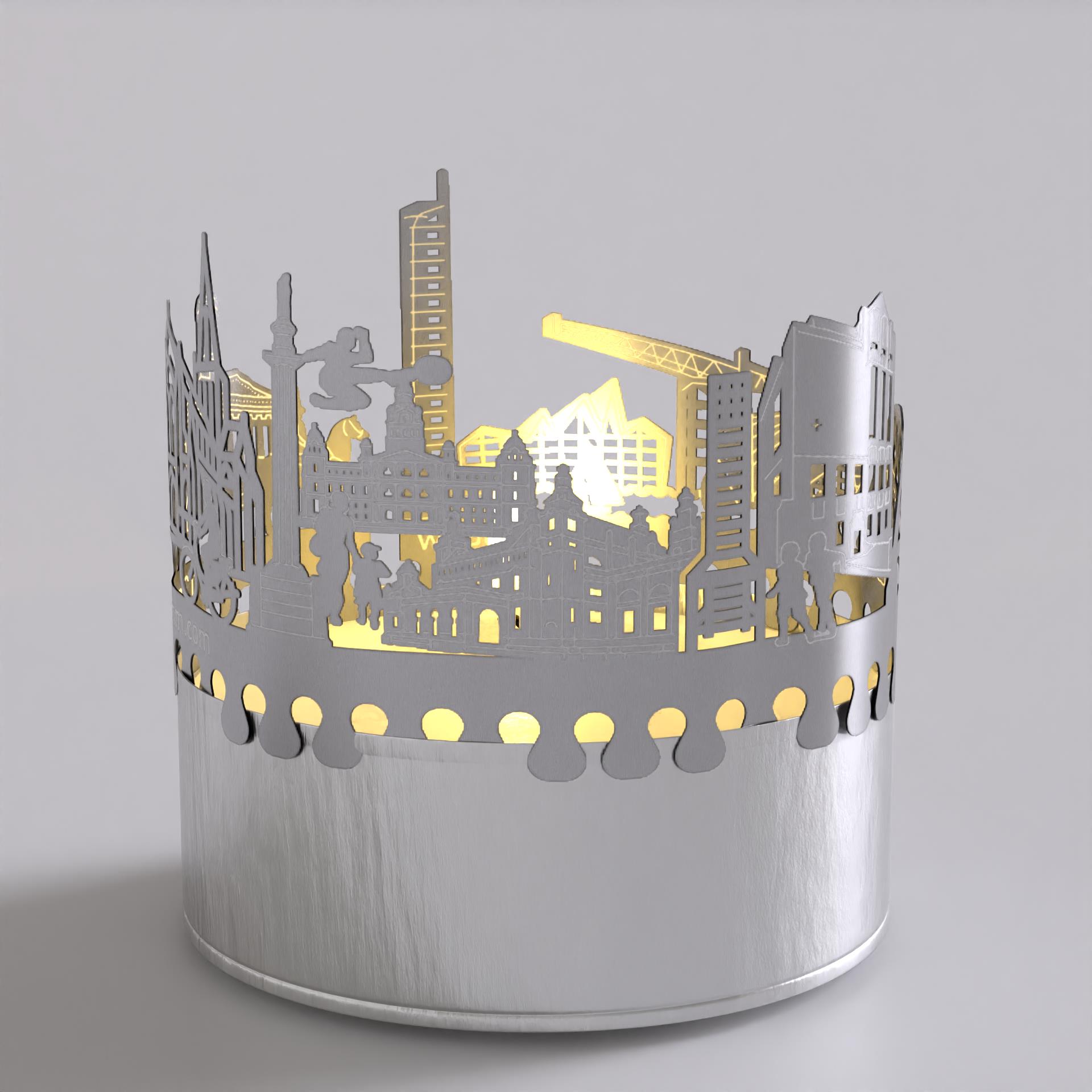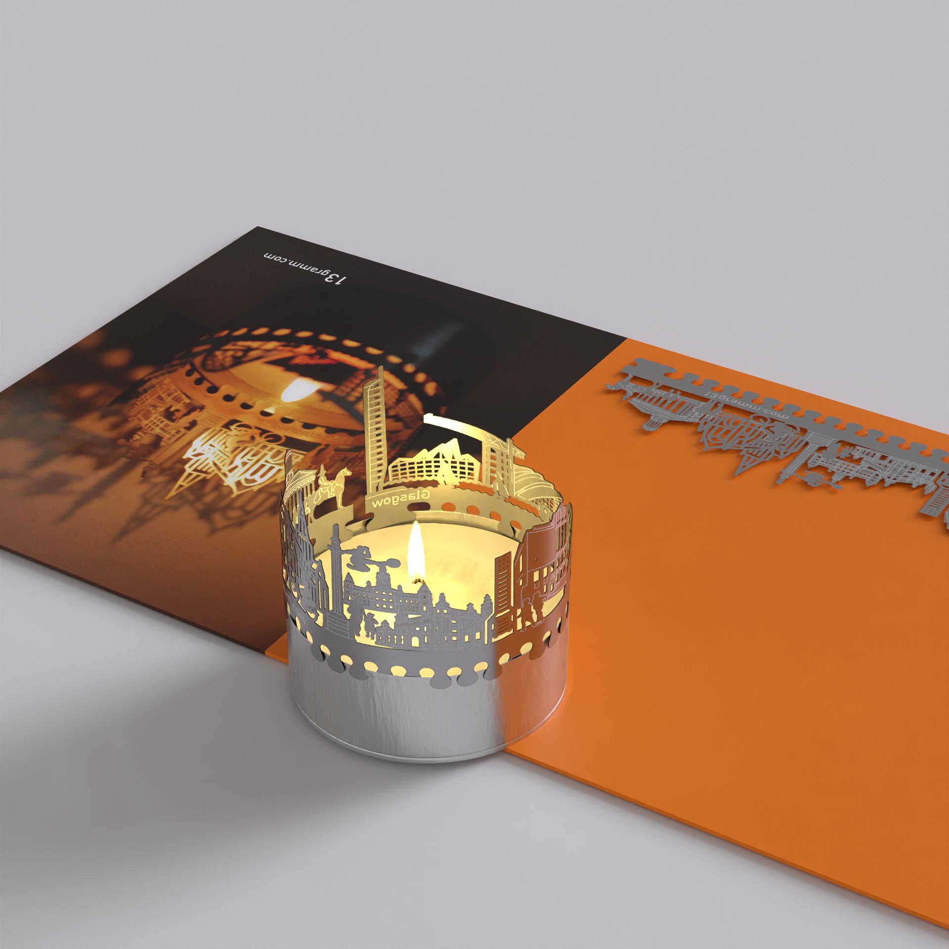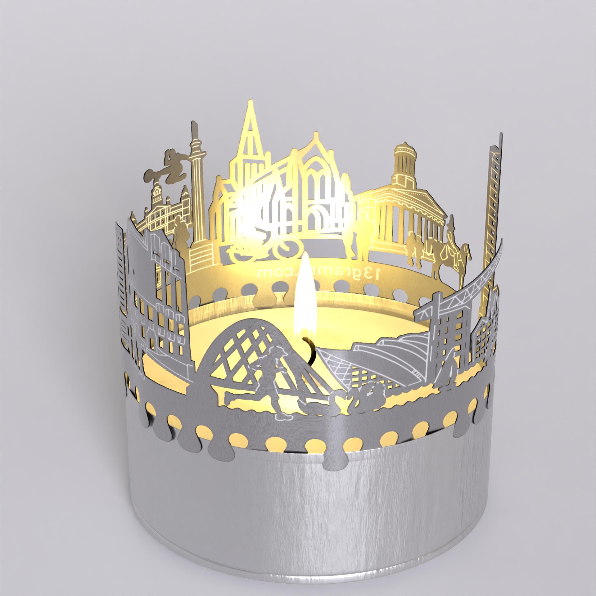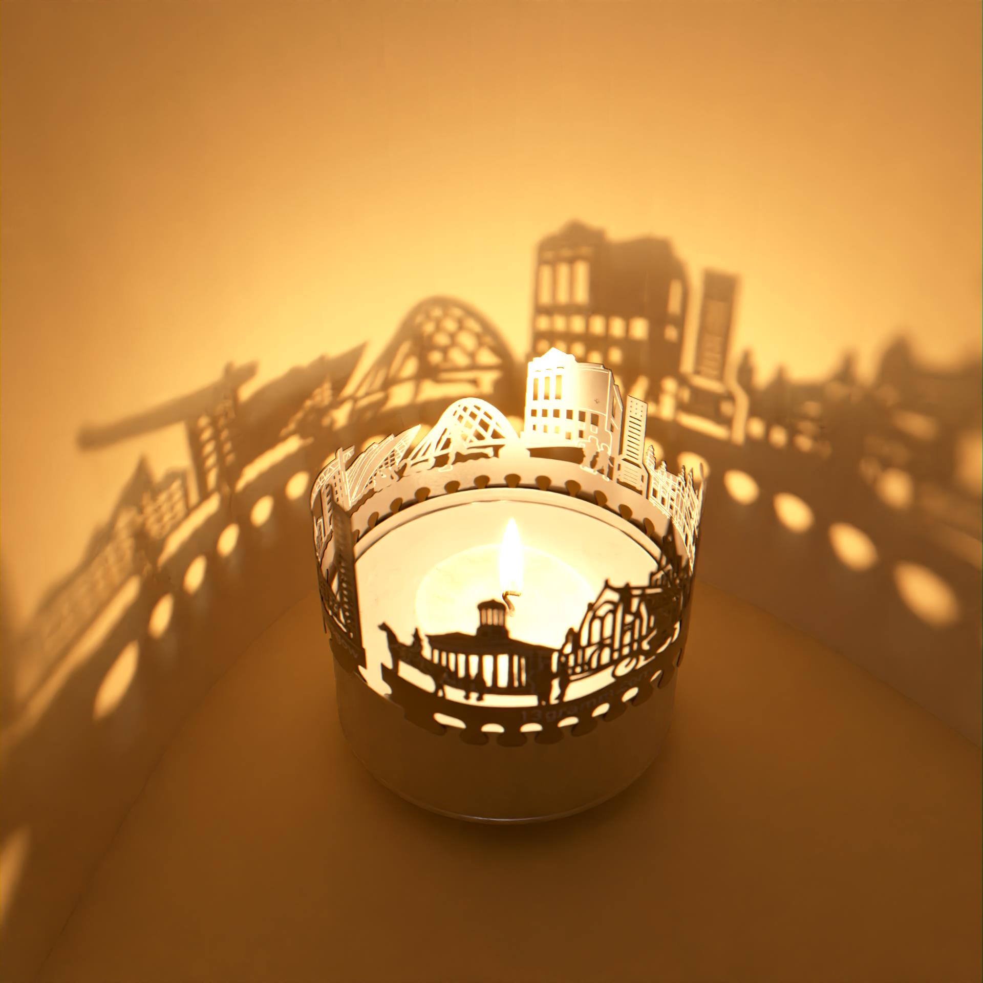 Erleben Sie ein einzigartiges Lichtspektakel mit dem Glasgow Skyline Schattenspiel! Mit diesem Kerzen-Aufsatz verwandeln Sie jedes normale Teelicht in einen atemberaubenden Blickfang. Die Edelstahl-Silhouette der Glasgow Skyline projiziert unverwechselbare Wahrzeichen wie den Glasgow Tower, die Clyde Arc Brücke und das Riverside Museum in Ihren Raum. Das Flackern der Kerze lässt die Skyline von Glasgow zum Leben erwachen und schafft eine einzigartige Atmosphäre.