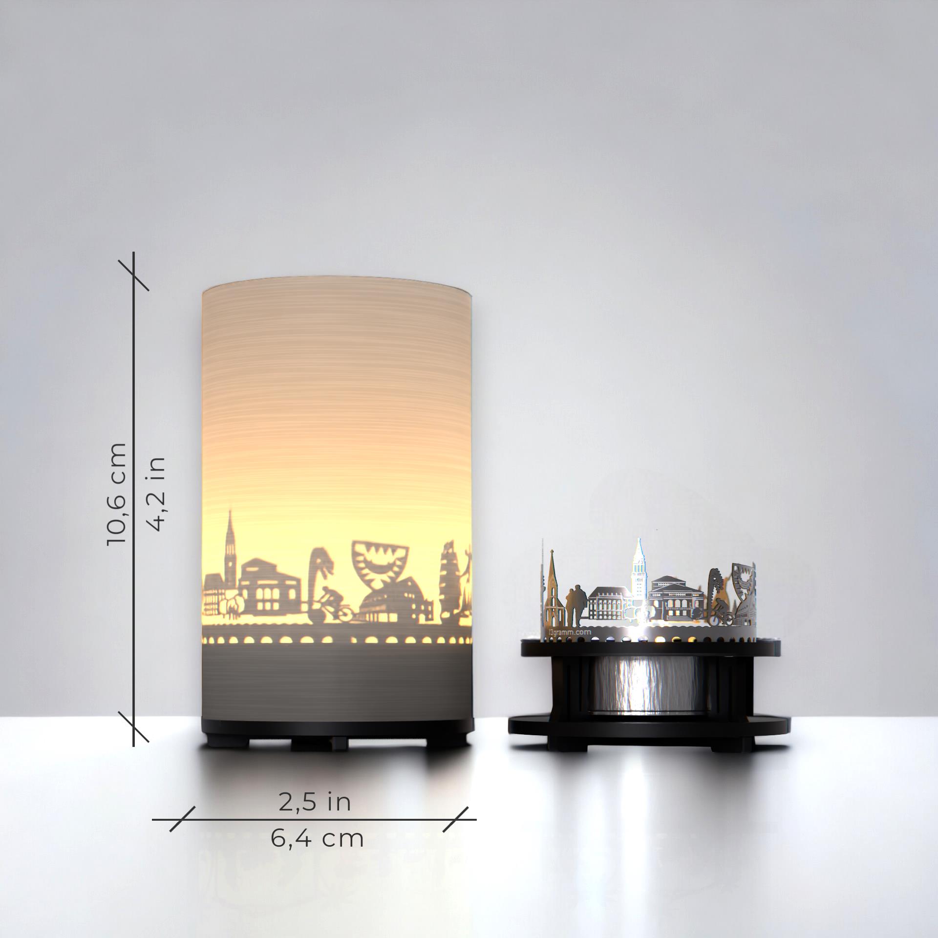 • In der Geschenkbox findest du eine hochwertige Edelstahlsilhouette, einen Projektionsschirm, einen Kerzenhalter und ein Teelicht. Das aufgebaute Windlicht hat eine Höhe von 100mm und einen Durchmesser von 65mm. Ideal zum Verschenken an Kiel-Fans, Reiselustige oder Weltenbummler.