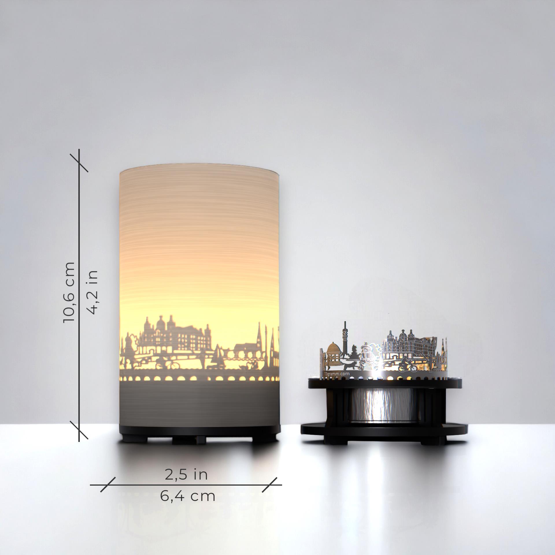 - Die Geschenkbox enthält eine hochwertige Silhouette aus Edelstahl, einen Projektionsschirm, einen Kerzenhalter und ein Teelicht. Mit einer Höhe von 100mm und einem Durchmesser von 65mm ist das Windlicht perfekt um Schwerin zu entdecken. Ideal zum Verschenken an Schwerin-Fans, Reiselustige oder Weltenbummler.