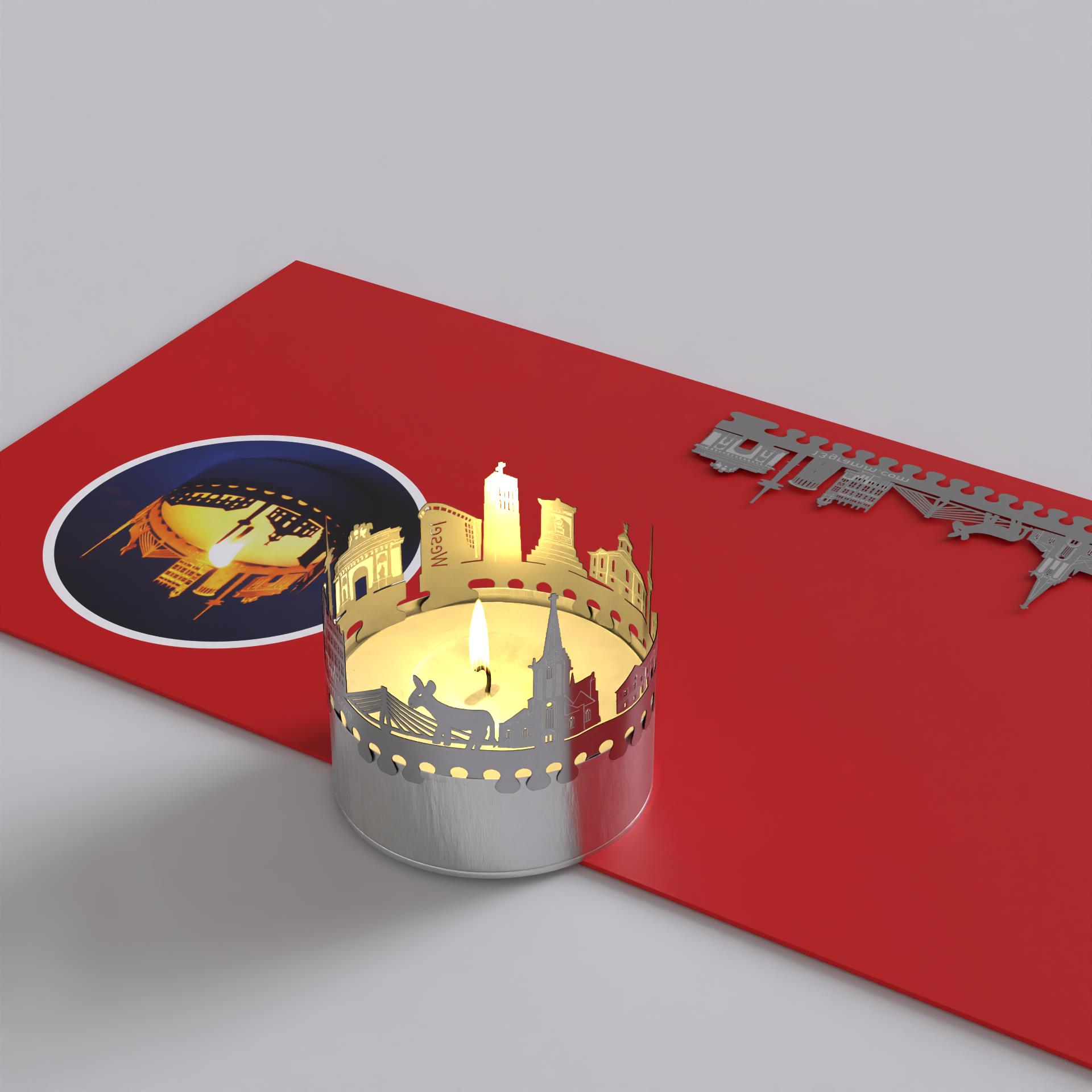 Entdecke die besondere Magie von Wesel mit dem Wesel Skyline Schattenspiel. Der Kerzen-Aufsatz verzaubert jedes Teelicht in ein wunderschönes Lichtspektakel und projiziert die Silhouette der Weseler Skyline in den Raum. Ob das historische Schloss Diersfordt oder der imposante Wasserturm – wir haben die schönsten Wahrzeichen der Stadt für dich in Szene gesetzt. Faszination pur!