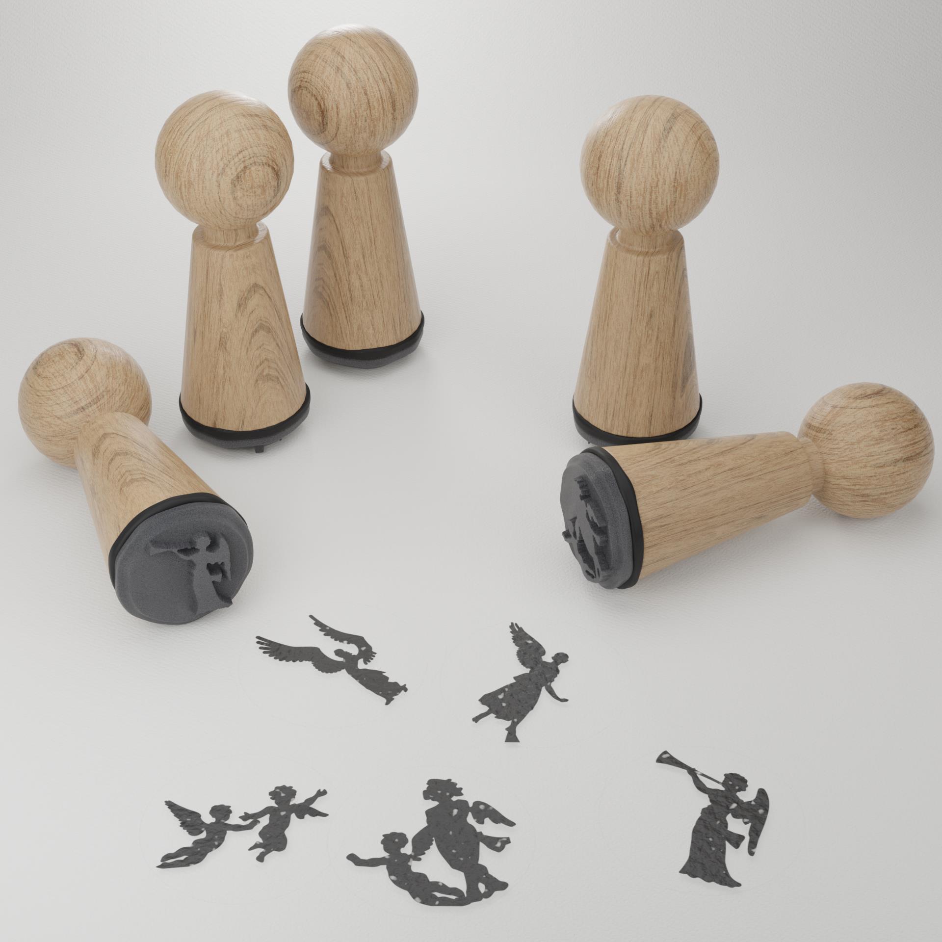 Lieferumfang: Stempelset, bestehend aus 5 verschiedenen Stempeln zum Thema Engel. Die Stempel sind aus hochwertigem Buchenholz gefertigt mit einer Höhe von 36mm und einem Durchmesser von 15mm. Das Stempelgummi ist auf einer federnden Schaumstoffschicht montiert.