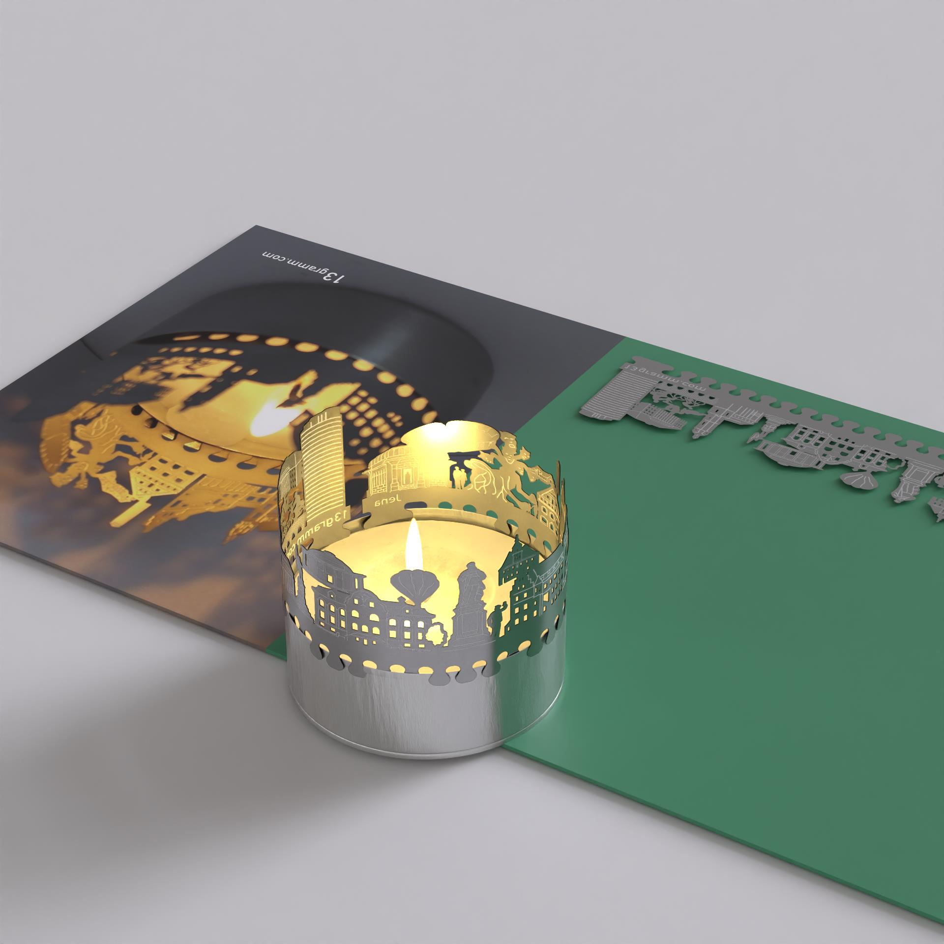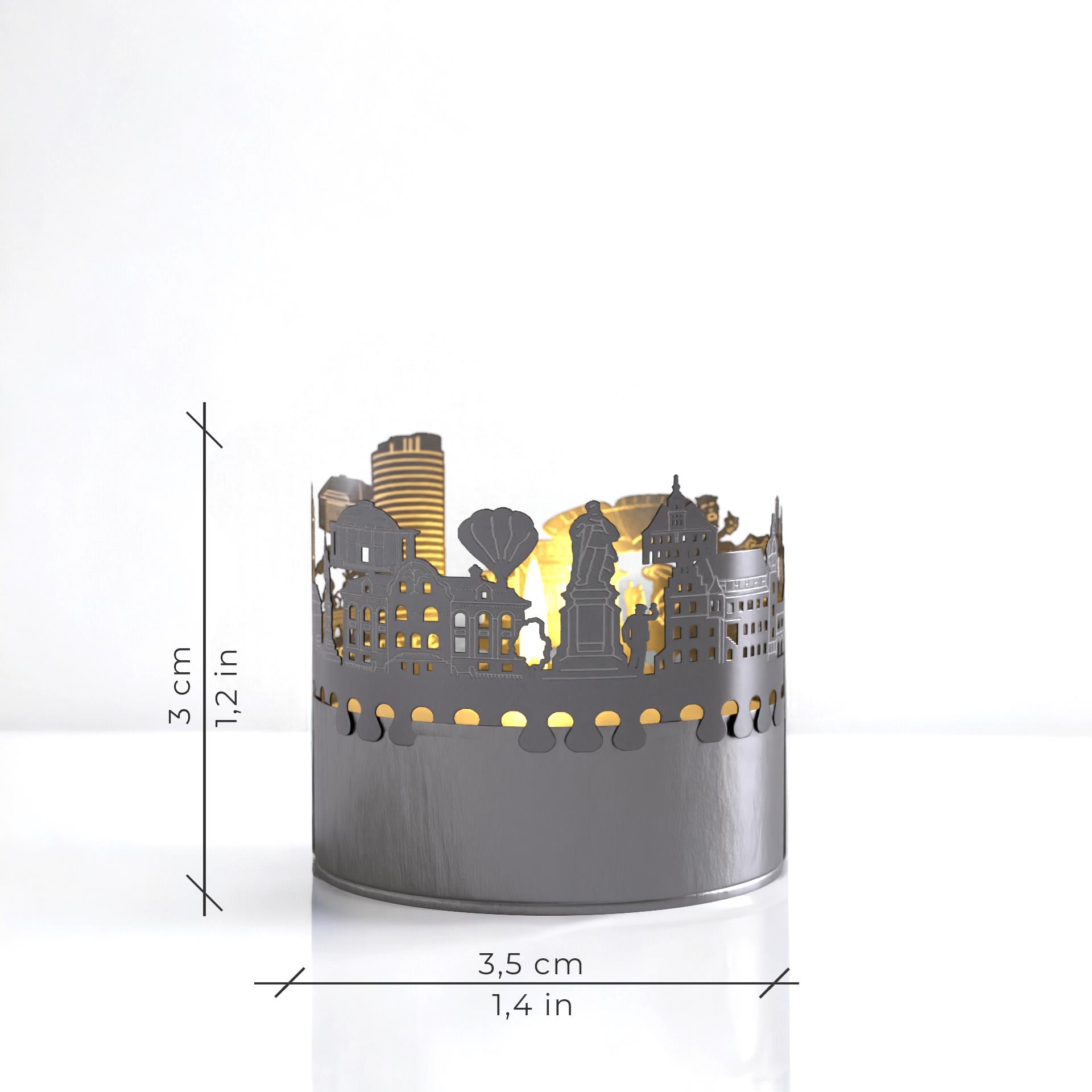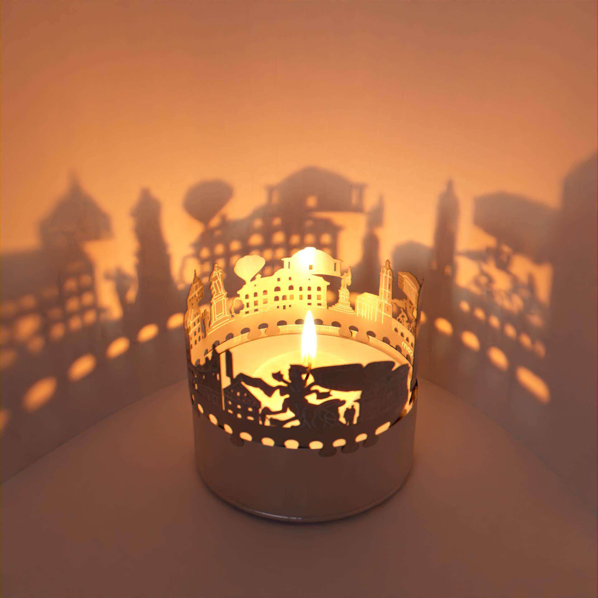 Erleben Sie das besondere Flair der Stadt Jena in Ihrem eigenen Wohnzimmer mit dem Jena Skyline Schattenspiel. Das Kerzen-Aufsatz zaubert aus einem gewöhnlichen Teelicht ein faszinierendes Schattenspiel. Die Edelstahl-Silhouette der Skyline von Jena projiziert die Wahrzeichen der Stadt wie den Jentower, die alte Rathausuhr und die Stadtkirche in Ihren Raum und verleiht ihm eine unverwechselbare Atmosphäre.