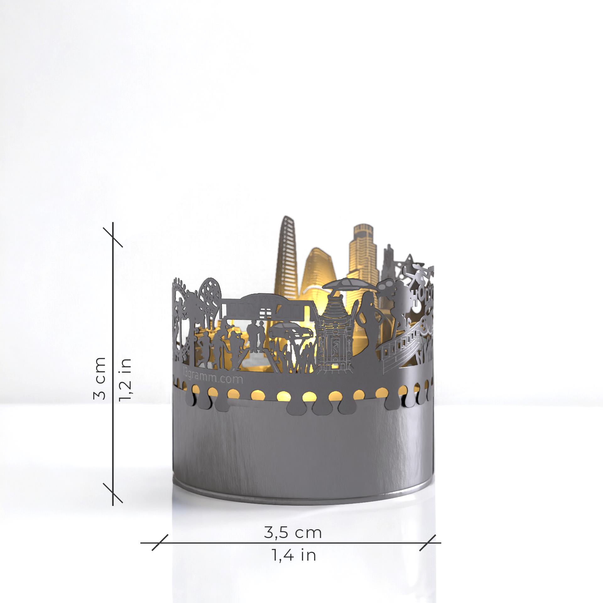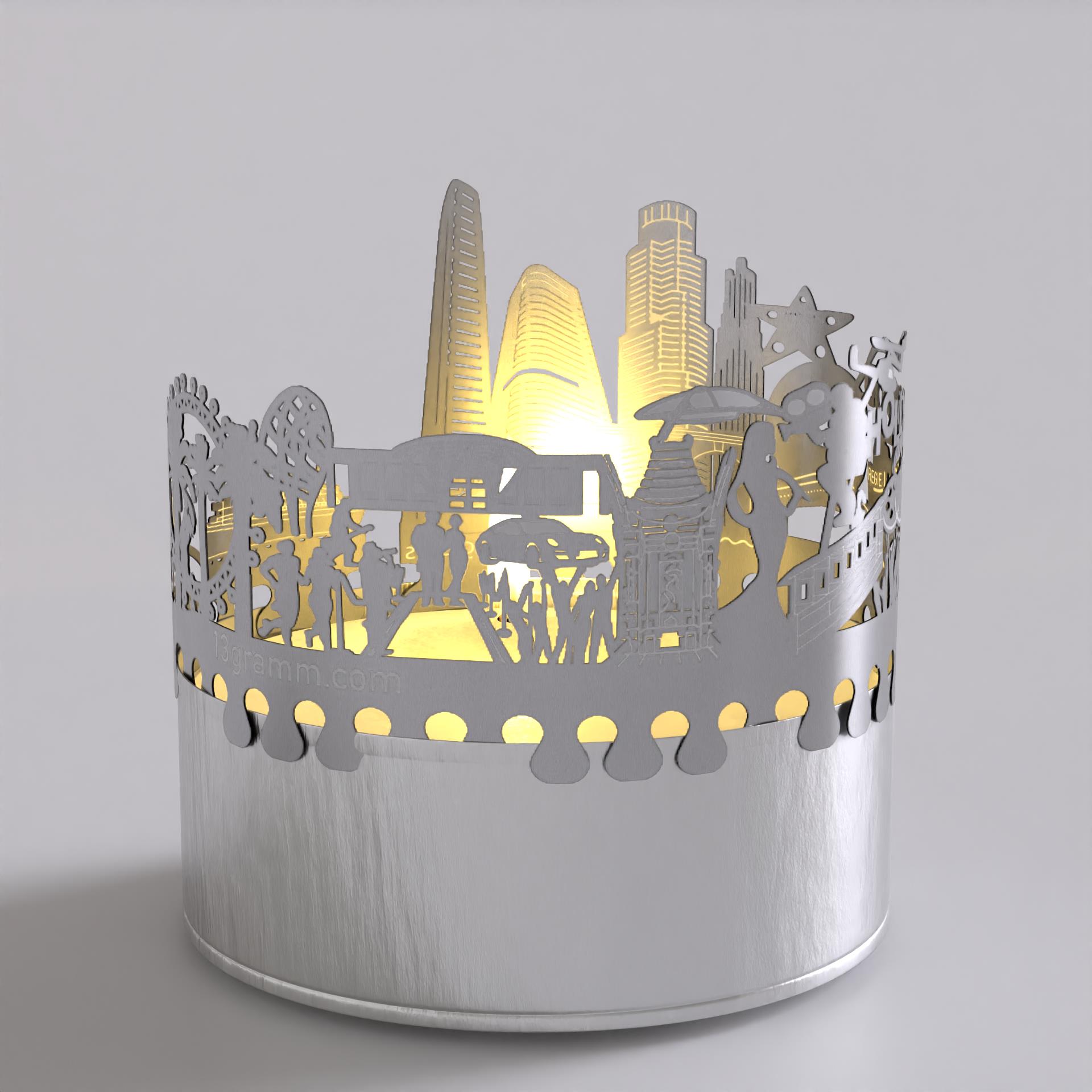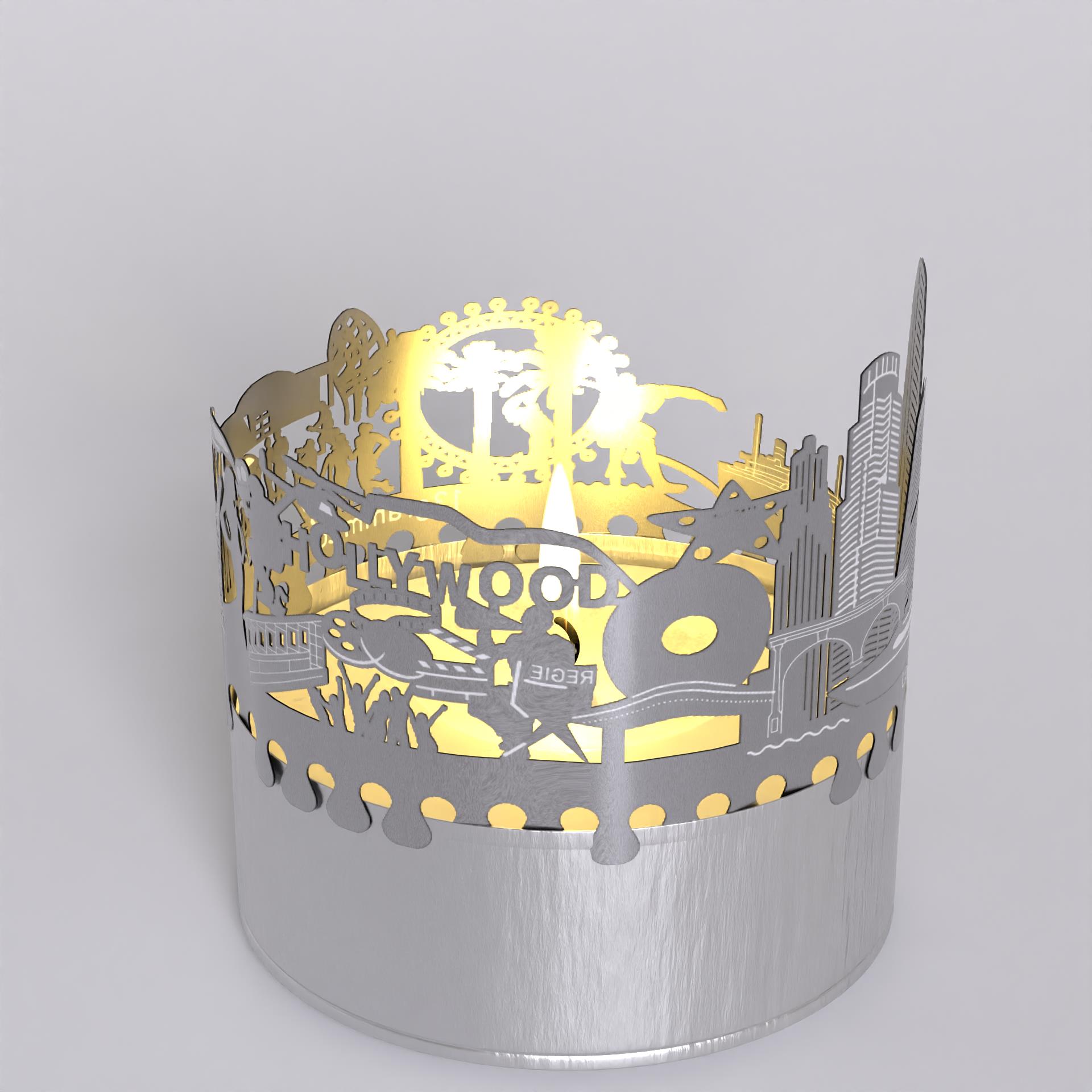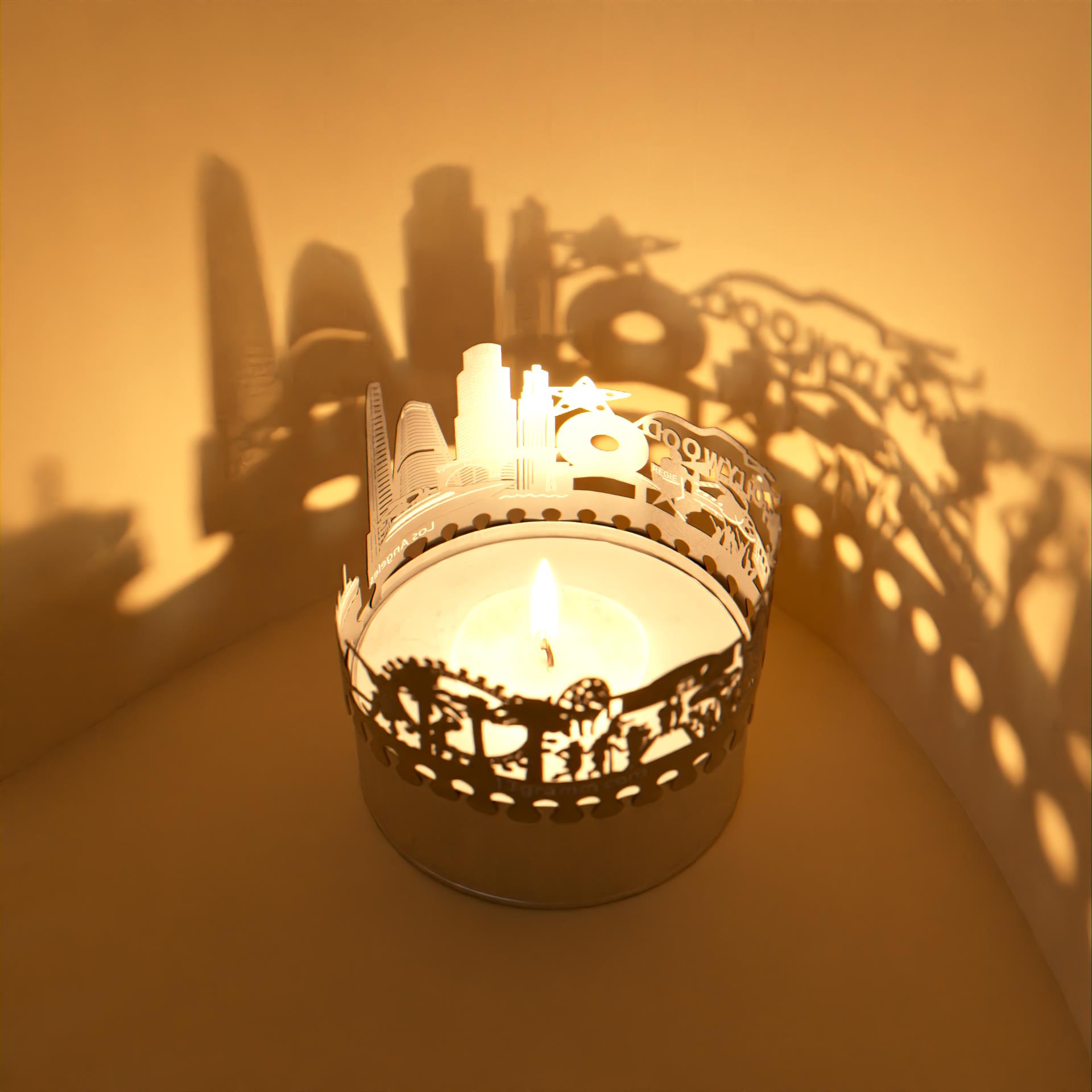 Das Los Angeles Skyline Schattenspiel ist das perfekte Souvenir für jeden, der die Stadt der Engel liebt! Dieser Kerzen-Aufsatz verwandelt gewöhnliche Teelichter in ein außergewöhnliches Licht-Spektakel. Die filigrane Edelstahl-Silhouette der Skyline von Los Angeles projiziert die Stadt in den Raum und durch das Flackern der Kerze erwacht die beeindruckende Skyline zum Leben. Einfach magisch!