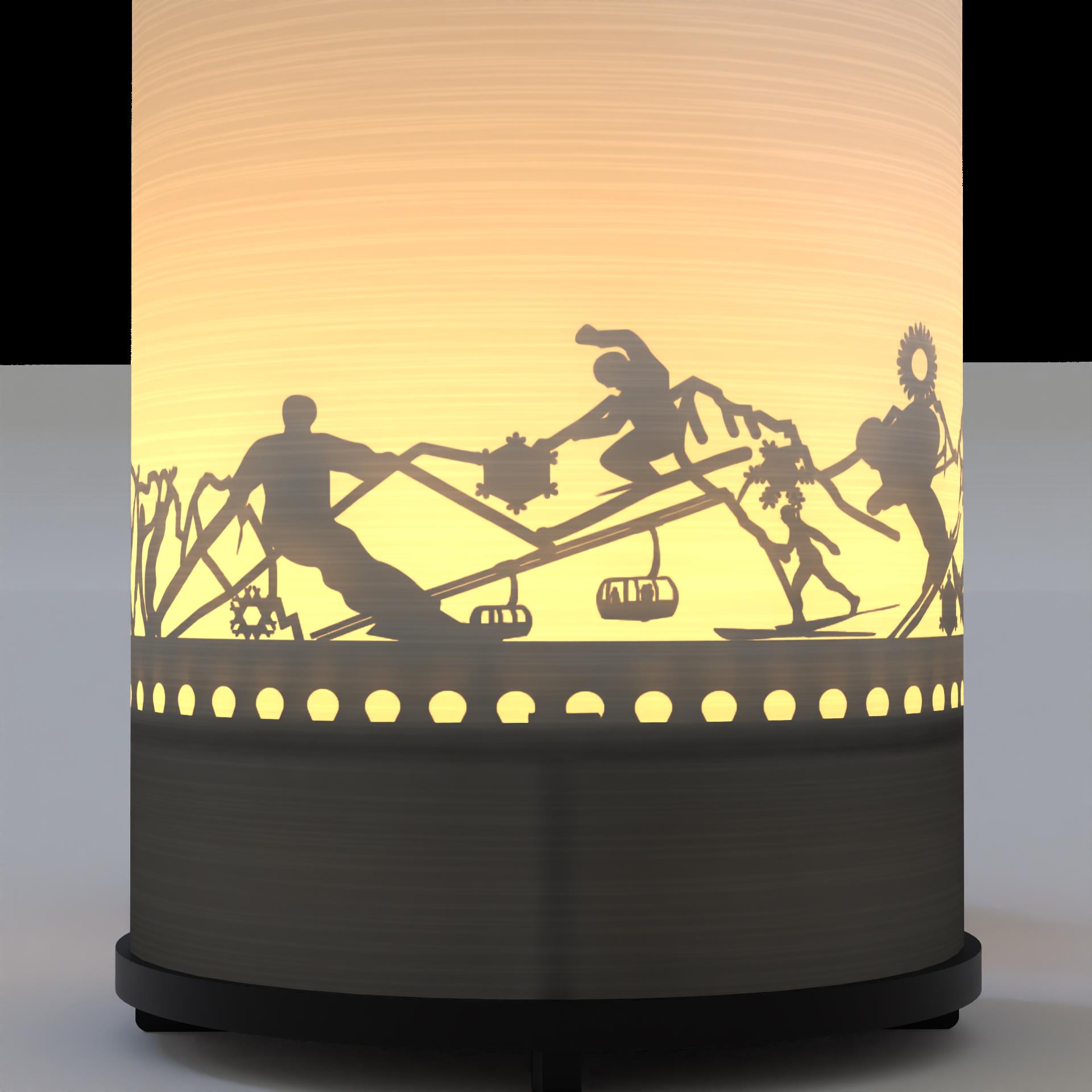 Folgende filigrane Motive können Sie in Ihrem Kerzen-Schattenspiel entdecken: Abfahrts-Ski, Langlauf, Berge, Schneefall, Piste, Gondel, Hüttengaudi