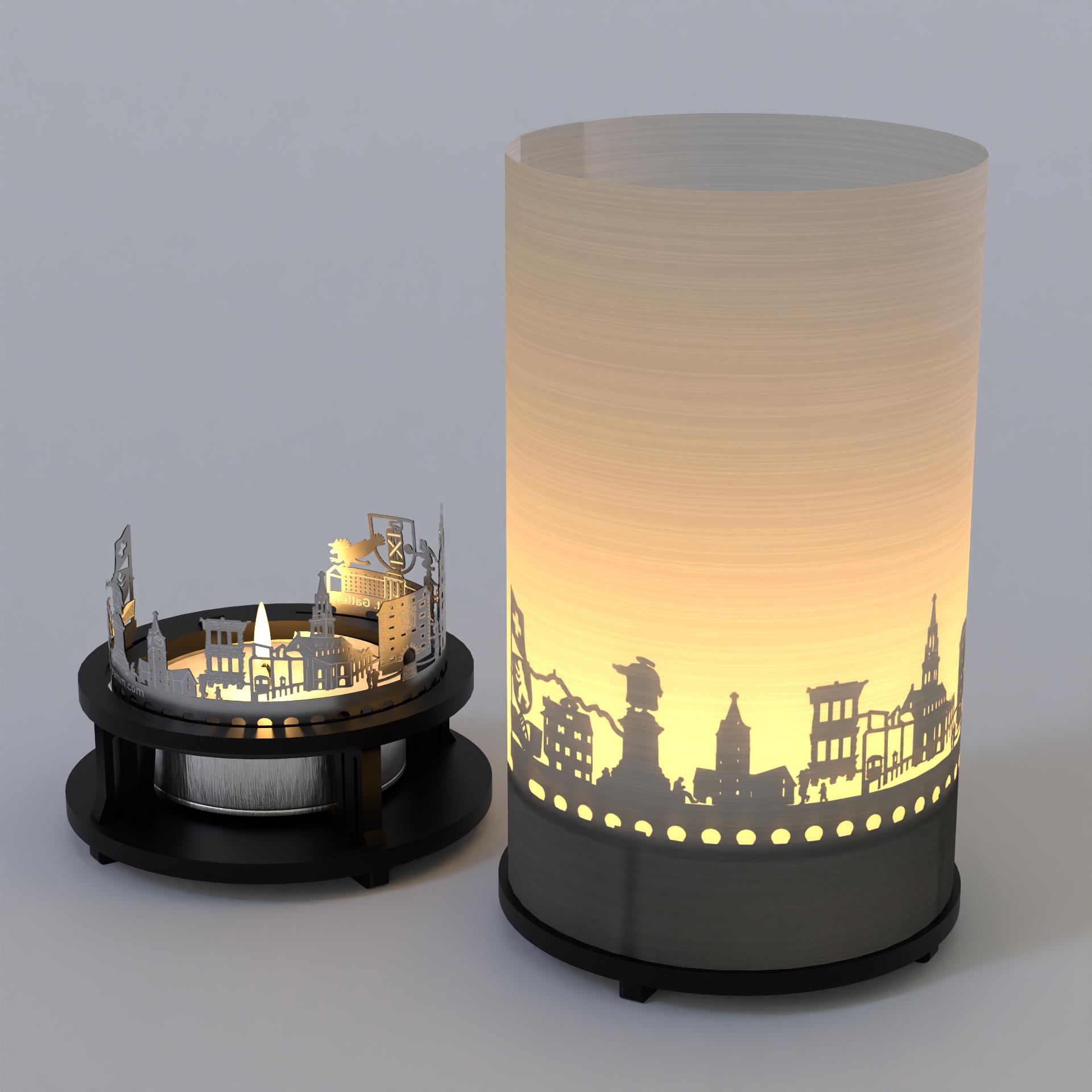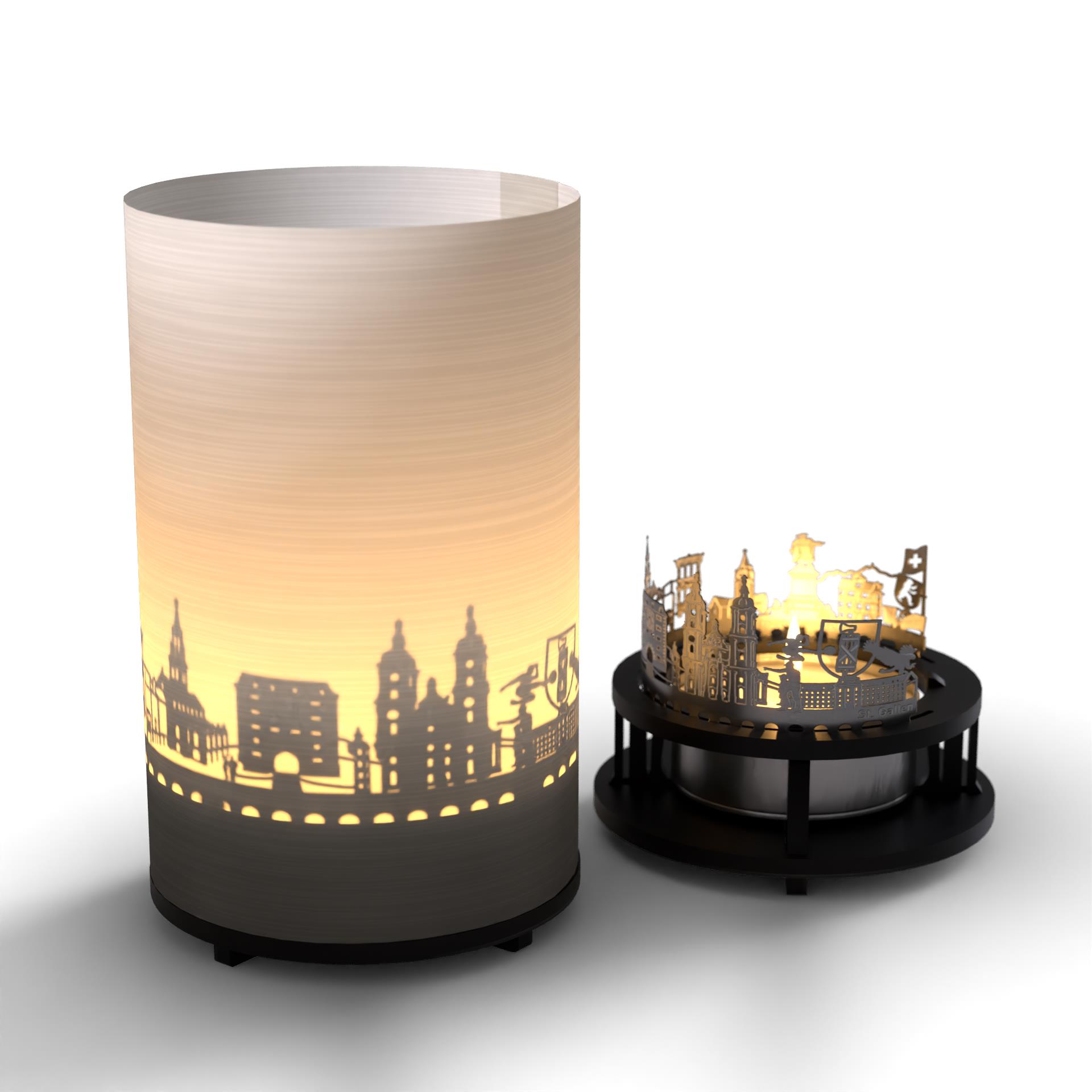 - In der Geschenkbox enthalten ist eine hochwertige Silhouette aus Edelstahl, ein Projektionsschirm, ein Kerzenhalter und ein Teelicht. Das aufgebaute Windlicht hat die Maße 100 mm Höhe und 65 mm Durchmesser. Diese Geschenkbox eignet sich perfekt zum Weiterverschenken an St. Gallen-Fans, Reiselustige oder Weltenbummler.